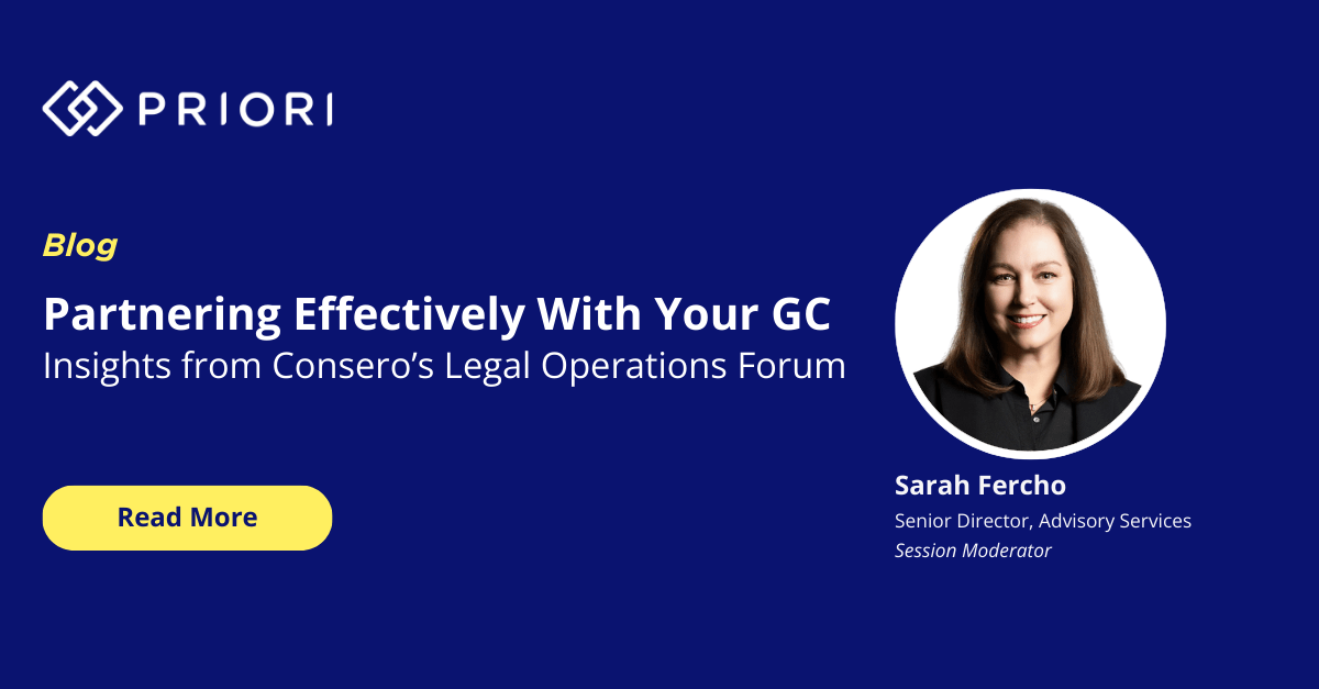 At Consero, Sarah Fercho, Senior Advisory Director at Priori, led a conversation with Legal Ops leaders from across industries on what it really takes to build effective GC partnerships during times of change. The conversation brought together leaders across different team sizes and reporting structures, but with one shared reality: when a trusted GC relationship works, Legal Ops becomes a strategic force. When it doesn’t, everything gets harder.
