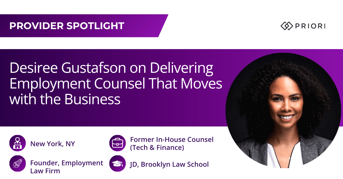 A trusted partner to in-house teams at companies like Brex, BCG, and Procore, Desiree Gustafson exemplifies the depth and versatility of talent in the Priori network. With experience in law firms, global HR teams, and enterprise legal departments, she brings a multidisciplinary lens to employment law, bridging legal risk with operational needs.